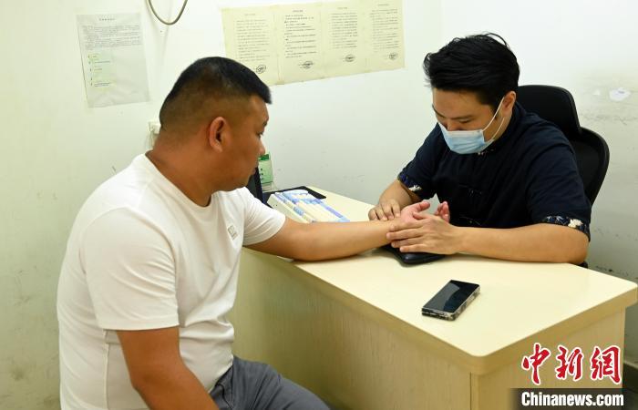 图为陈冠岩在给患者号脉。中新社记者 蒋雪林 摄