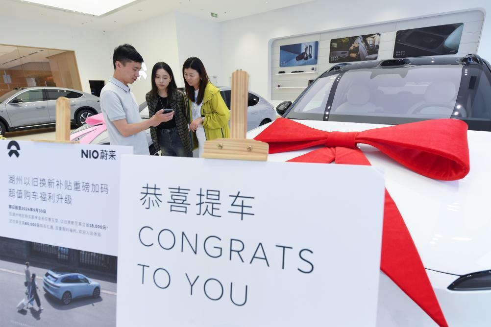 9月24日,在位于湖州市湖东街道的蔚来交付中心,销售人员向顾客介绍提车后如何申领以旧换新补贴。新华社记者 翁忻旸 摄