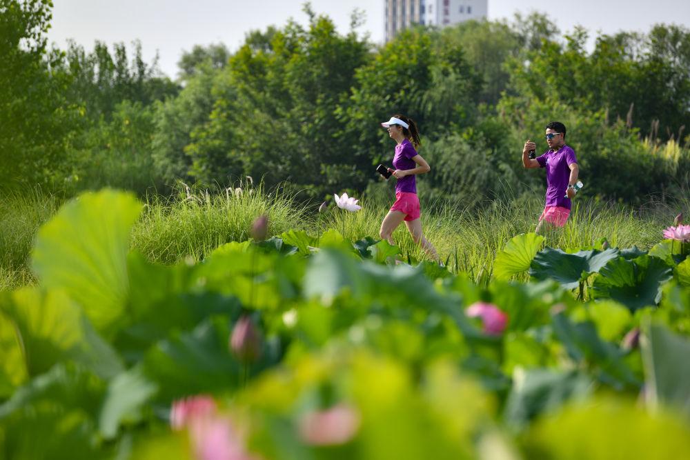 2024年6月23日,市民在陕西省汉中市天汉湿地公园内运动休闲。汉江是长江的最大支流,是南水北调中线工程的重要水源。近年来,汉中市加强对汉江源头和沿岸湿地生态保护修复,构建人水和谐共生的美丽城市,确保“一泓清水永续北上”。