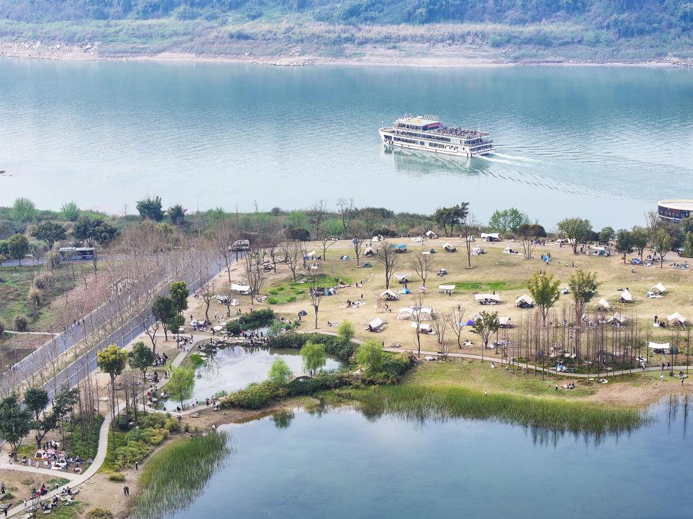 2024年3月16日,游客在重庆广阳岛东岛头一带游览、休闲(无人机照片)。广阳岛是长江上游最大的江心岛。近年来,当地系统推进自然恢复、生态修复,丰富生物多样性。2024年,重庆广阳岛生态修复项目成功入选联合国“生态恢复十年”优秀案例。