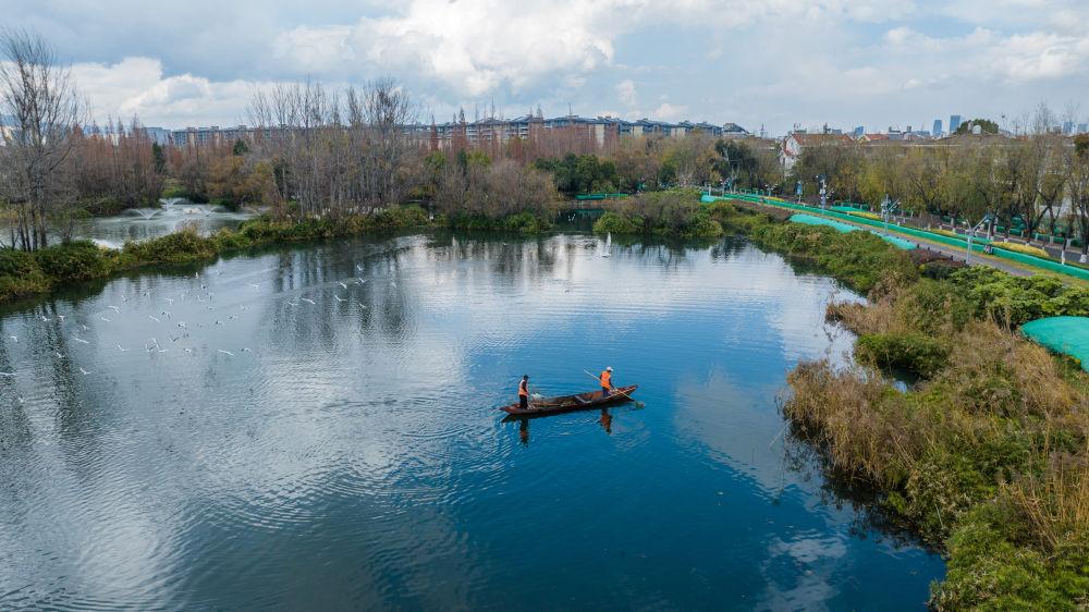 2024年1月16日,管护人员在滇池打捞杂物(无人机照片)。据昆明市滇池管理局介绍,2023年滇池全湖水质持续向好,自2018年上升为Ⅳ类水质后,连续六年保持全湖水质Ⅳ类。
