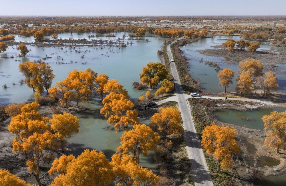 2023年11月4日拍摄的新疆尉犁县罗布淖尔国家湿地公园(无人机照片)。新疆沿塔里木河流域分布着约1500万亩胡杨林,是世界面积最大的胡杨林区。