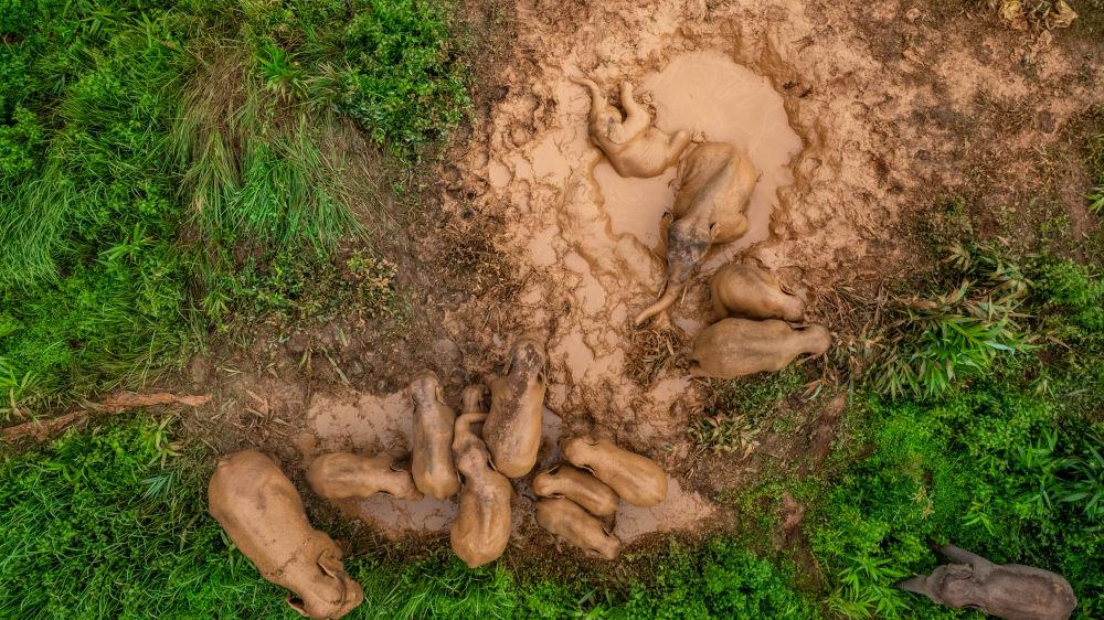 2024年8月8日,“短鼻家族”和“然然家族”的野象在云南省西双版纳州景洪市大渡岗乡的泥塘里玩耍(无人机照片)。近年来,云南修复改造了一些大象栖息地,种植大象爱吃的植物,同时运用红外相机等技术手段,实现亚洲象位置信息的实时发布。
