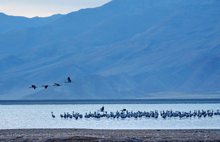 在雅鲁藏布江中游河谷黑颈鹤国家级自然保护区,黑颈鹤飞翔在一片水域上空(2024年3月17日摄)。多年来,西藏各级党委政府和对口援藏省市接续投入2.4亿余元资金开展生态建设,创设的雅江北岸南木林生态示范区已完成造林4万多亩,昔日戈壁荒滩渐变江畔绿洲,也成了黑颈鹤越冬的理想栖息地。监测数据显示,西藏境内的黑颈鹤种群数量持续增长,已由上世纪的不足3000只增长到目前的1万余只。