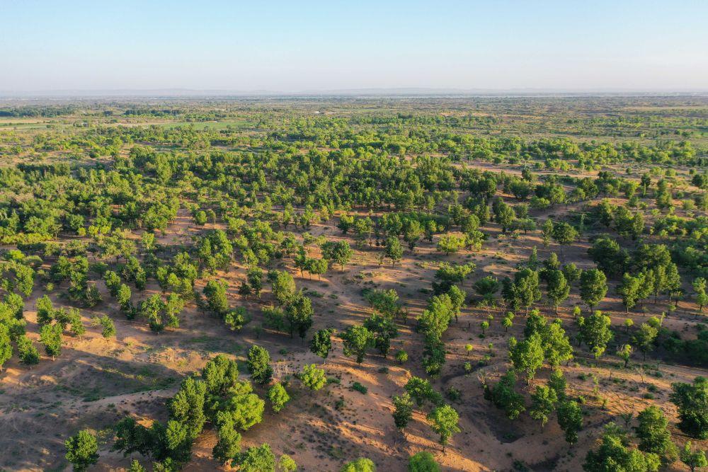 2023年6月14日在内蒙古毛乌素沙地拍摄的当地牧民种植的一片树林(无人机照片)。2024年以来,内蒙古全面开展“三北”工程攻坚战,已完成防沙治沙面积约1954万亩,约为年度总任务1730万亩的113%,超额完成年度任务。