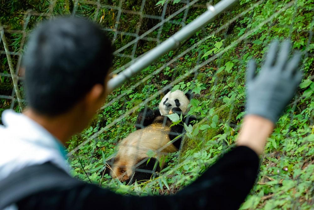2024年6月24日,在位于大熊猫国家公园卧龙片区内天台山的大熊猫第二阶段野化培训场外,工作人员给母熊猫“贤贤”投喂完食物后挥手向其告别。近年来,我国通过大力实施天然林保护、野生动植物保护和大熊猫国家公园建设等,保护大熊猫及其栖息地,成效显著。大熊猫野外种群总量已从20世纪80年代的约1100只增长到近1900只。