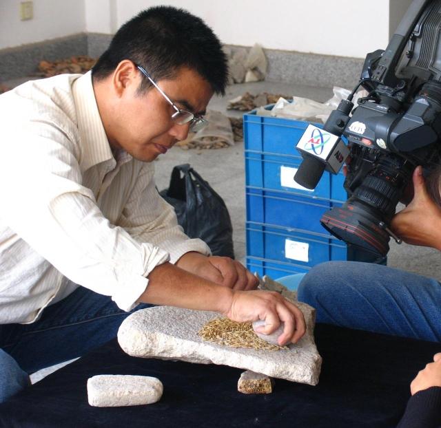蒋乐平用石磨盘进行稻谷脱壳实验