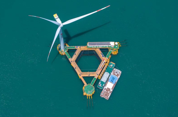 试想一下这样的场景:水下养鱼、水上发电,既生产清洁电力,又孕育“蓝色粮仓”。来到莆田市南日岛,一座巨型“风车”——全球首座风渔融合浮式海上平台“国能共享号”,随着海风转动。