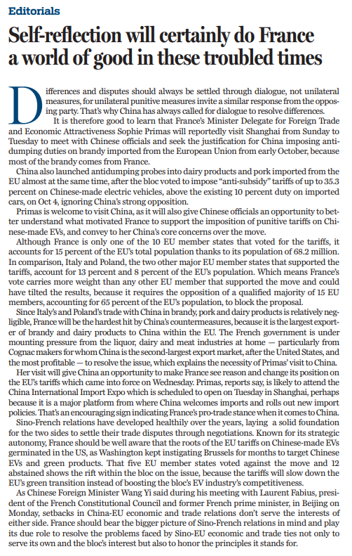 欧盟加征关税的措施生效之际,普里马斯的到访将给中国提供一个说服法国、改变法国的机会。据报,普里马斯将出席定于11月5日在上海开幕的进博会。进博会以进口为主题,是中国推动高水平开放的平台。一直以来,法国对华展现出的自由贸易立场,令人鼓舞。
