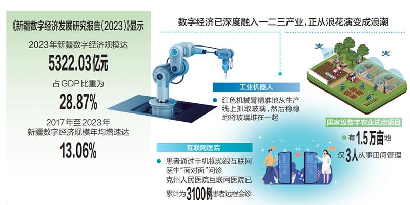 近年来,数字经济产业生态不断丰富,企业数字化转型浪潮风起云涌。《新疆数字经济发展研究报告(2023)》显示,2023年,新疆数字经济规模达5322.03亿元,占GDP比重为28.87%。2017年至2023年,新疆数字经济规模年均增速达13.06%。记者专门采访了一、二、三产业数字技术应用典型场景,一探这片孕育新动能的蓝海之深浅。