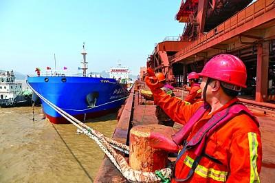 工人在宁波舟山港指挥船舶靠岸。舟山市新闻传媒中心张磊拍摄