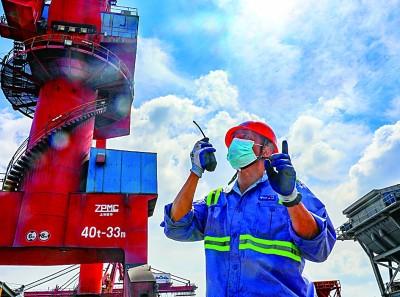 工人在宁波舟山港综合保税区码头指挥吊机。舟山市新闻传媒中心张磊拍摄