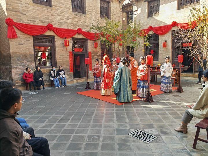 随着演员齐声吟诵,古院落中,一场明制出阁礼正在上演。不大的小院挤满了观礼游客,院外不少人没挤进来,还在踮脚朝里望。这里是山西省高平市河西镇的喜镇苏庄景区。