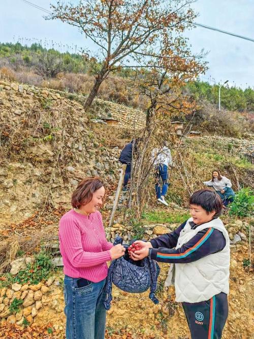 徜徉在小路上,偶遇从河南新乡长垣市自驾而来的游客于女士一行人,她们正在山坡上采摘刚刚熟透的山楂。于女士告诉记者,她们这几个邻居经常自驾来松庙村游玩,夏天时还常在村里小住。