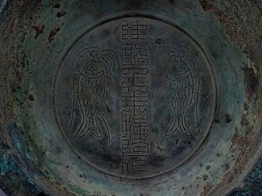 铜洗底部,双鱼之间铸有铭文“建初四年朱提造作”。“建初”是东汉第三个皇帝刘炟的年号,建初四年即公元79年,此铜洗的制作时间距今已近2000年。