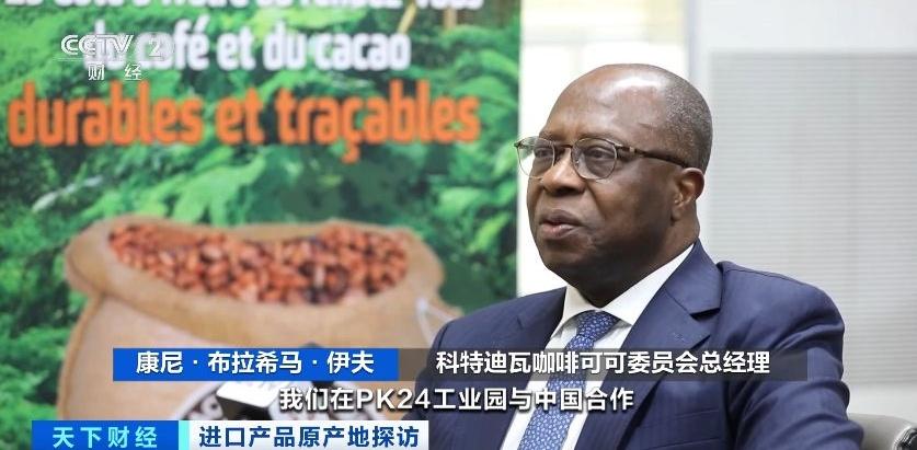 科特迪瓦咖啡可可委员会总经理 康尼·布拉希马·伊夫:我们在PK24工业园与中国合作,建设了科特迪瓦规模最大的国有可可仓储区和加工厂,希望提高可可加工能力,增加可可产业的附加值,实现产业转型。