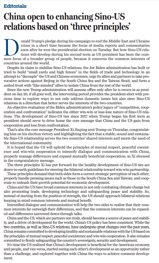 这也正是中国领导人在贺电中向特朗普发出的核心信息,在祝贺他当选美国总统的同时强调一个稳定、健康、可持续发展的中美关系符合两国共同利益和国际社会期待,希望双方秉持相互尊重、和平共处、合作共赢的原则,加强对话沟通,妥善管控分歧,拓展互利合作,走出一条新时期中美正确相处之道,造福两国,惠及世界。