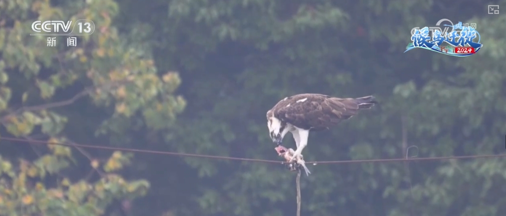 在金华兰湖湿地观鸟点,几名观鸟爱好者架好相机,对准正在捕食的鹗,安静地观察着它的一举一动。只见这只鹗用双爪紧紧抓住鱼,迅速升空,随后停留在湖边树林中的电线上慢慢享用。吃完鱼,它还会贴近水面飞翔,清洗爪子。