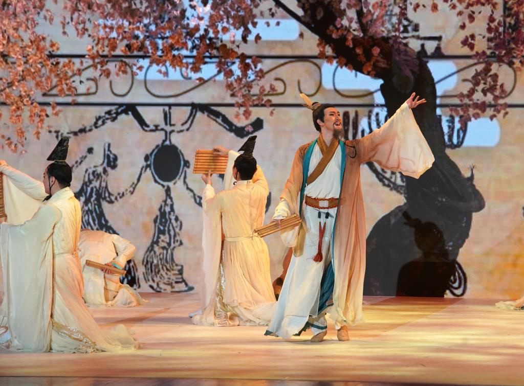 中国国家博物馆剧场内,中国歌剧舞剧院的艺术家演出了原创民族舞剧《孔子》片段、经典古琴曲目《流水》,和以民族室内乐改编的希腊经典曲目《俄狄浦斯王》等,在舞台上呈现中西艺术的交相辉映。