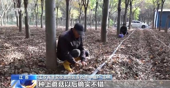 江苏省淮安市淮阴区赤松茸种植户 王林:现在一天能采收300公斤左右,平均批发价格每公斤30元,还供不应求。这个林地以前一直闲置着,种上蘑菇确实不错,多了一份很好的收入。