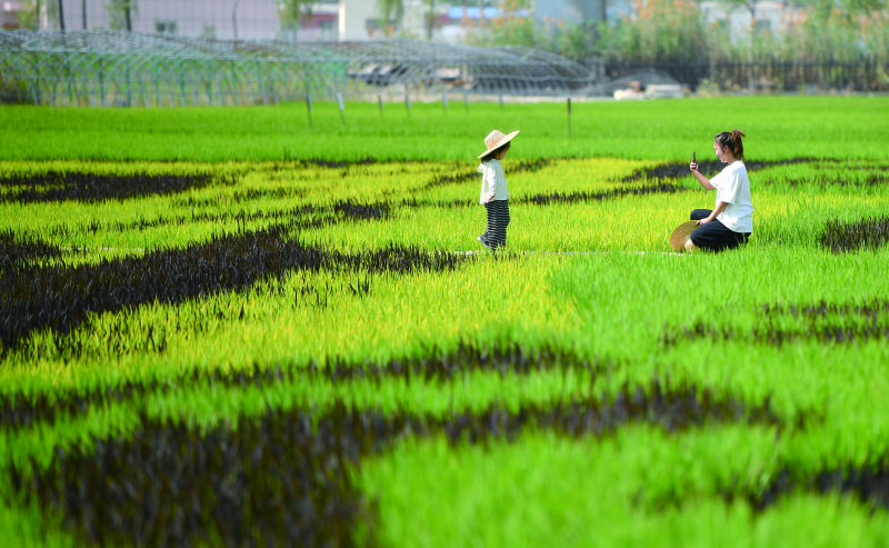 游客在位于乌鲁木齐市米东区羊毛工镇新建村的水稻科技示范园拍照。邹懿/摄