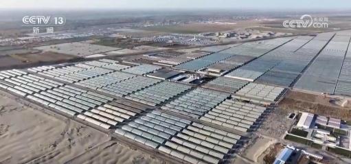记者来到和田地区最大的设施农业的现场,站在楼顶上,记者看到的都是设施农业的温室大棚。这个项目从2019年开始建设,到2022年的4月份建起了总共1000座大棚,现在这里的占地面积已经达到1万亩。当年,工作人员刚来到这儿的时候是什么样?我们找到了两张对比照片,2019年,我们看到的这面前就是植被非常稀疏的一整片的沙漠,在2020年一期110座大棚建成的时候,场景已经很壮观了。而现在,这里的1000座大棚每年可以出产大概7万吨的瓜果蔬菜,保障南疆和田地区和喀什地区的蔬菜供应。同时,它还为周边12个乡镇提供2500个稳定的就业岗位,并且上下游关联,为和田提供了5000个就业机会。