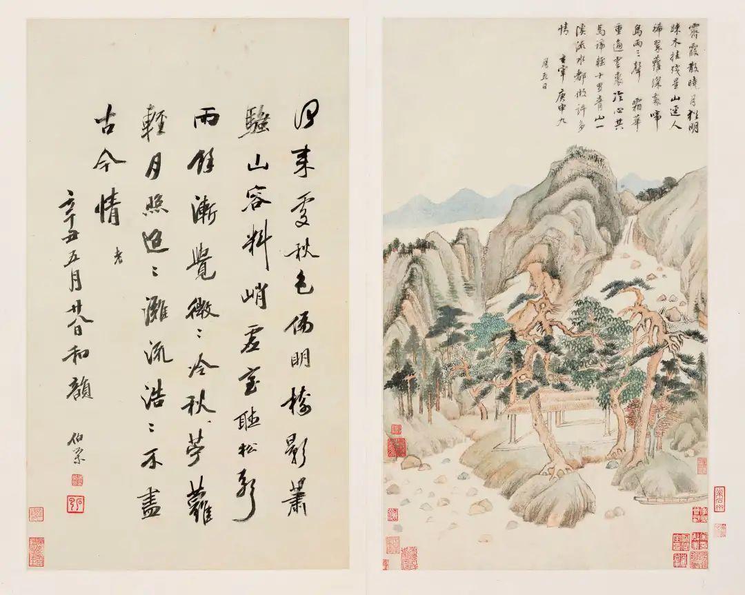 此册设色八景,作于1620年秋,时董氏舟行苏州、镇江一带。其云峰石迹,迥出天机,笔思纵横,参乎造化。笔墨与意境,可谓无不臻妙。王维曾言“宿世谬词客,前身应画师”,而对于董氏超迈之性情,用右丞之评,确为妥帖。题句录有杜甫、陆游、白朴等人名篇。董氏曾言“诗不必画合”,然视其笔墨性情所透露的高华雍容之意,与婉约典雅之诗词意韵仍为一境。董氏时年六十六岁,参合唐宋元各大家,设色尤其受赵孟頫影响,为其代表作。册前附曾鲸、项圣谟合作《董文敏小像图》页。