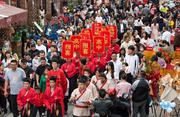 数百年前,金榜题名和状元游街堪称古代科场举子殿试后梦寐以求的大事。在五里古街,鸣锣开道,状元巡游,热闹的街区、复古的妆容、庄严的队伍,瞬间把人拉回到古代。