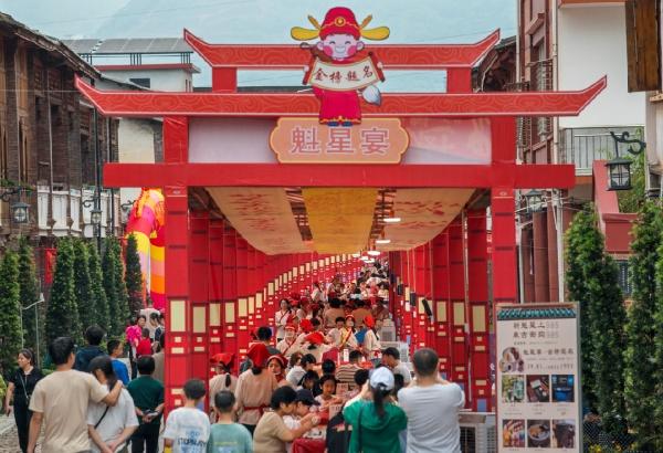游客在五里古街品尝魁星宴(陈志鹏摄)