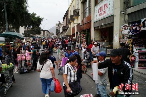 当地时间11月12日,秘鲁首都利马,唐人街上推销商品的小贩。中新社记者 盛佳鹏 摄