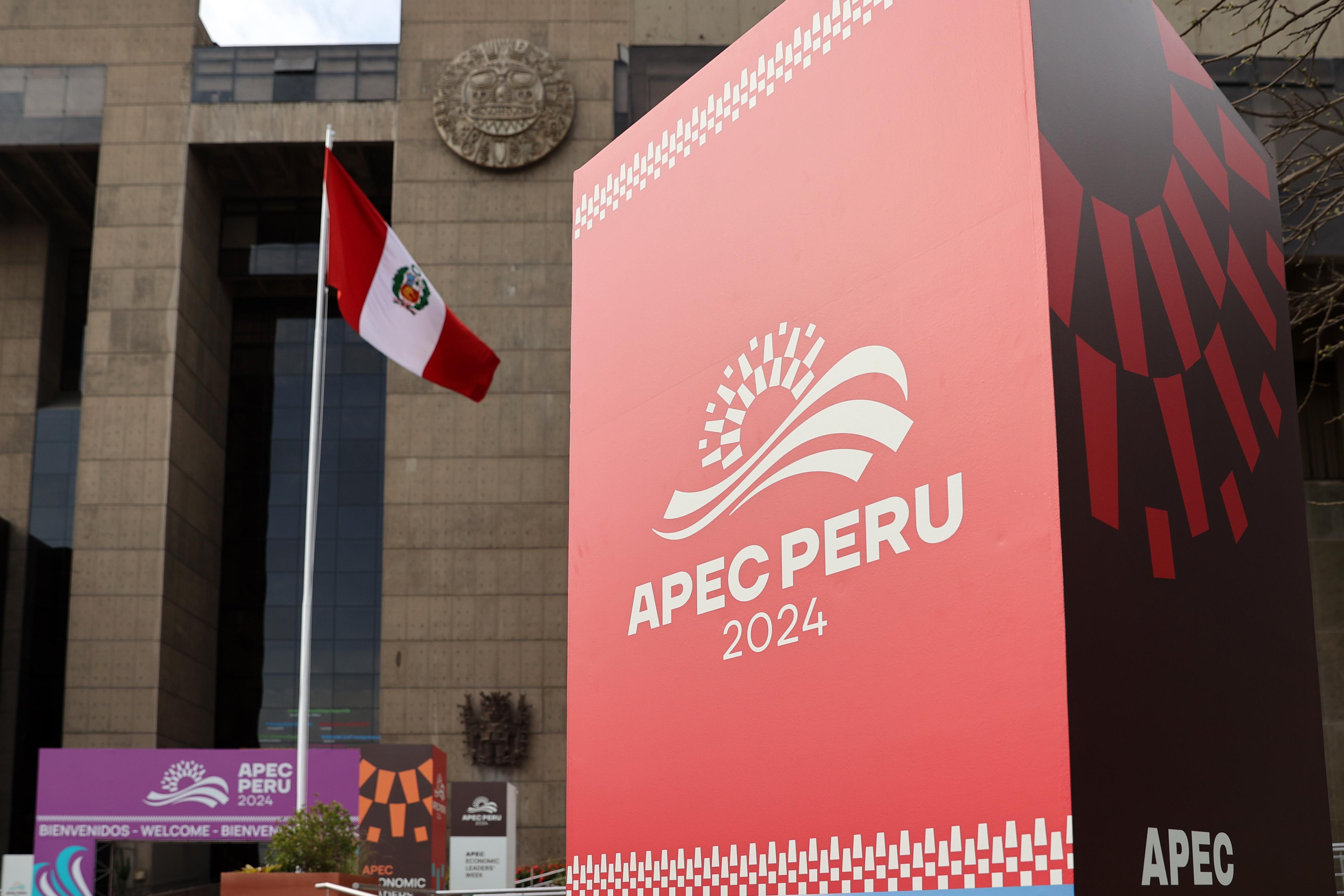 这是11月8日在秘鲁利马拍摄的2024年亚太经济合作组织(APEC)会议标识。新华社记者 许睿 摄