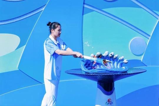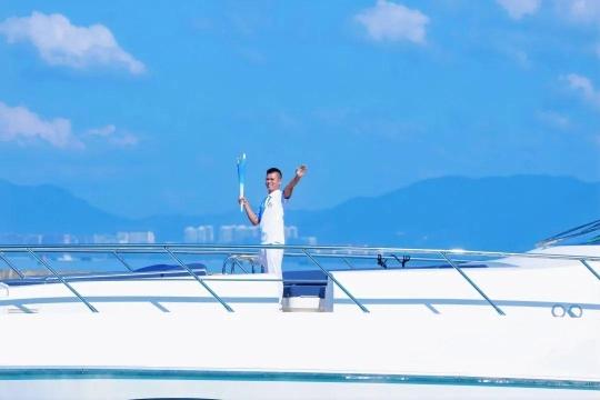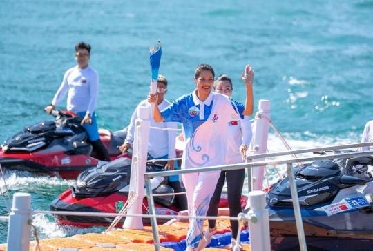 火炬传递了民族大团结、共圆中国梦的美好愿景,点燃了亿万中华儿女团结奋进、扬帆征程的豪情壮志。随着第107棒火炬手——全国帆船锦标赛冠军黄丽珠走下摩托艇,点燃火种盆。