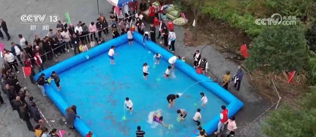 在捕鱼现场,当地还设立了捕鱼体验区,大人们协力拉紧绳索收拢大网,体验丰收的喜悦;小朋友们也撸起袖子,挽起裤腿用网捞鱼,沉浸式体验捕鱼的乐趣。