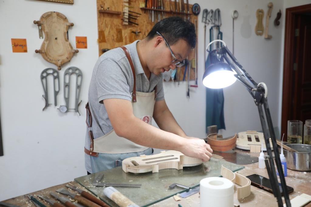 雕刻琴头、做好琴箱背板弧线,是制琴手艺的难点,“面板最薄处只有2.2毫米,毫厘之差,都会影响提琴的音色。”刘尊飞说,“你的作品‘出生’的时候,相当于你给它赋予了生命,那个时候就会有一种强烈的成就感。”