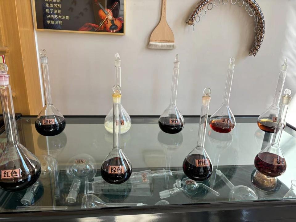 但现在东高村镇的提琴,都用上了天然的“绿色漆”。华东乐器的展柜里,摆放着“姜黄”“紫檀”“松香”等各色油漆玻璃瓶。