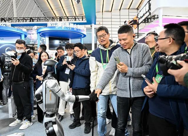 11月19日,在2024年世界互联网大会“互联网之光”博览会人形机器人专区,参观者与一款人形机器人握手。新华社记者 蔡湘鑫 摄