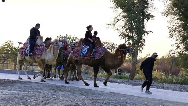 游客在塔河源景区骑骆驼观胡杨。王芳芳 摄