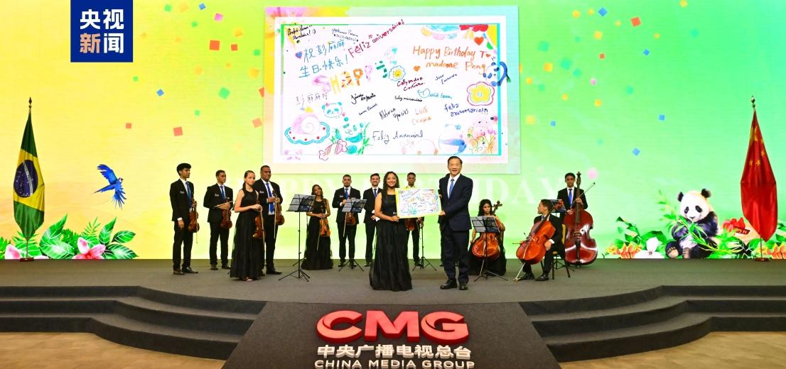 曾在2019年巴西利亚金砖峰会期间为彭丽媛教授演奏的巴西青少年管弦乐团现场演奏了巴西歌曲《新时代》和中国歌曲《在希望的田野上》,祝愿中巴友谊地久天长。乐团还特别演奏了《生日快乐歌》,并献上全体乐团成员签名的贺卡,向彭丽媛教授祝福生日快乐。总台台长代为接收。