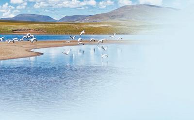 飞鸟掠过巴彦喀拉山下的湖泊。记者贺勇摄