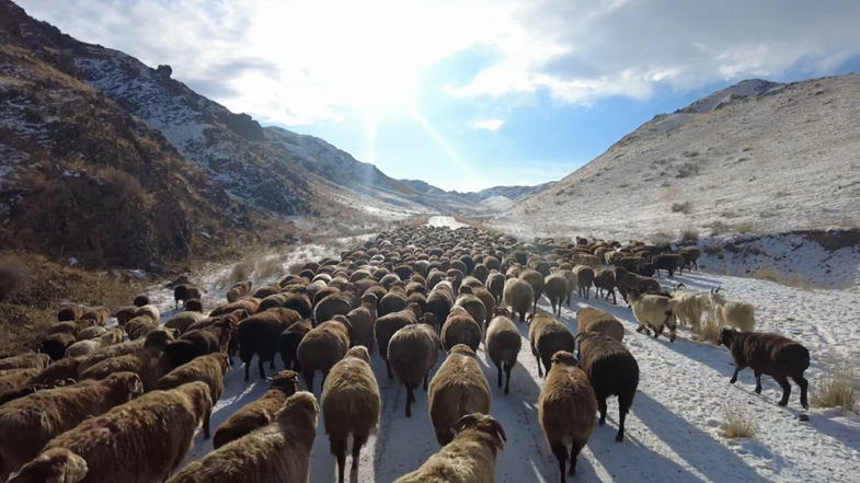 新疆阿勒泰地区吉木乃县,23万余头(只)牲畜浩荡集结,迎来了一场规模宏大的冬季转场。畜群组成的队伍,犹如千军万马,气势如虹地踏上了旅程。当地的牧民们赶着自家畜群,向着萨吾尔山脚下的冬牧场进发。