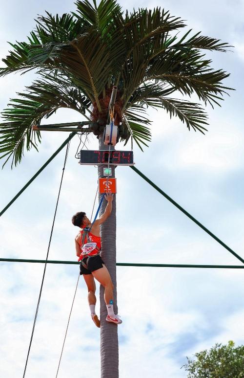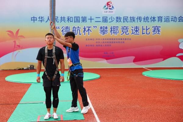 攀椰竞速比的是速度,考验的是运动员的攀爬技巧、体能耐力和核心力量。裁判员李岩介绍说,每个运动员的攀爬动作可以自由发挥,攀爬技巧也不一样,但都对运动员的力量和协调性有很大要求。