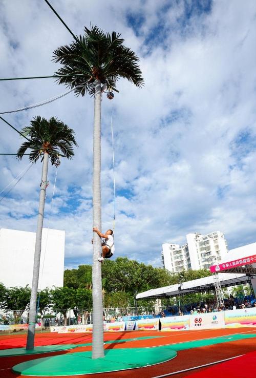 新华社三亚11月23日电 你爬过树吗?你能想象爬树也能成为比赛项目吗?23日,作为第十二届全国少数民族传统体育运动会的新增竞赛项目,攀椰竞速比赛在三亚拉开帷幕,上演椰子树上的“速度与激情”。
