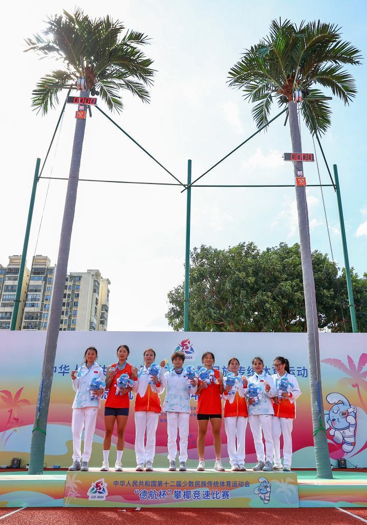 新华社三亚11月24日电 24日,第十二届全国少数民族传统体育运动会攀椰竞速比赛结束争夺,海南队的罗军和符诗军分获男子、女子一等奖。