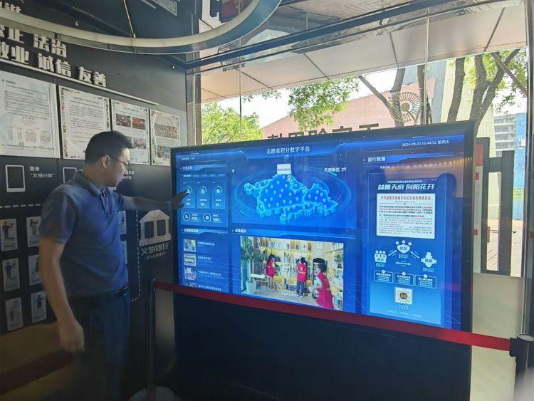 麓湖公园社区工作人员在介绍志愿者积分数字平台。新华社记者董小红 摄