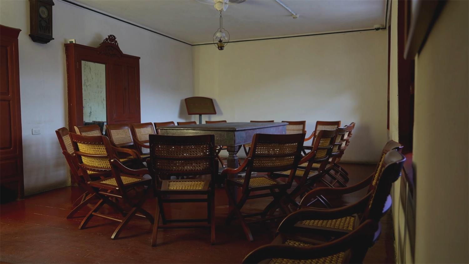 二楼的东厢房被临时布置成会议室,房间正中放着一把板栗色的柏香木长桌,周围有18只木边藤心靠背椅,屋顶正中吊着一盏煤油灯,左墙上有一架挂钟。