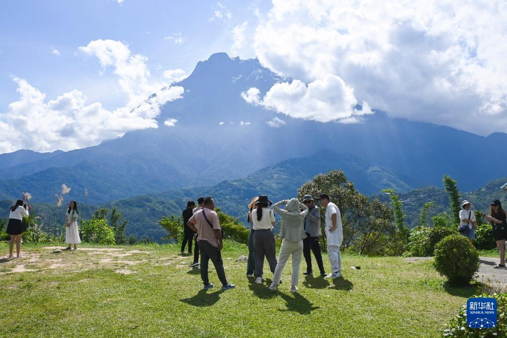 6月29日,游客在马来西亚沙巴州的基纳巴卢山附近留影。新华社记者 程一恒 摄