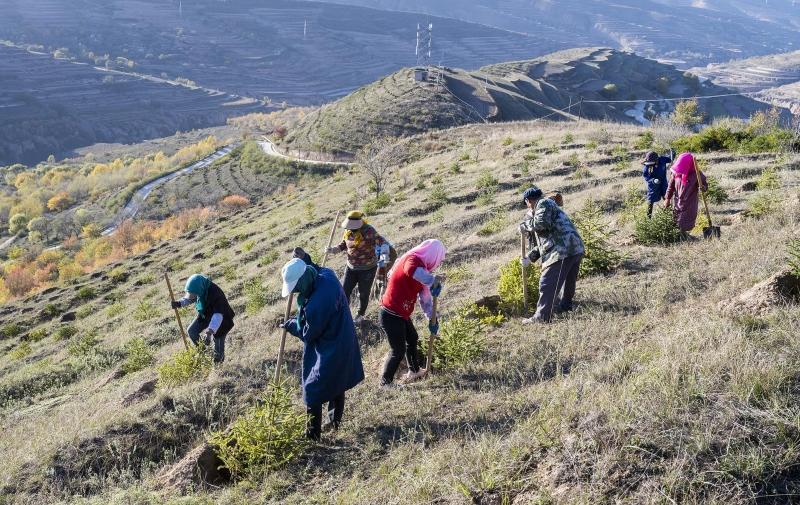2024年10月22日,甘肃定西,工人们进行植树作业。