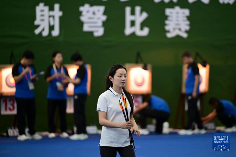 本届全国少数民族传统体育运动会上,射弩比赛在上海外国语大学三亚附属中学体育馆进行。运动员绷紧了神经,一手持弩,一手托举,目视前方,拉弦、装箭、瞄准、击发,一支支离弦之箭直奔靶心而去。一旦有运动员击中10环,现场总会响起一阵阵欢呼声。