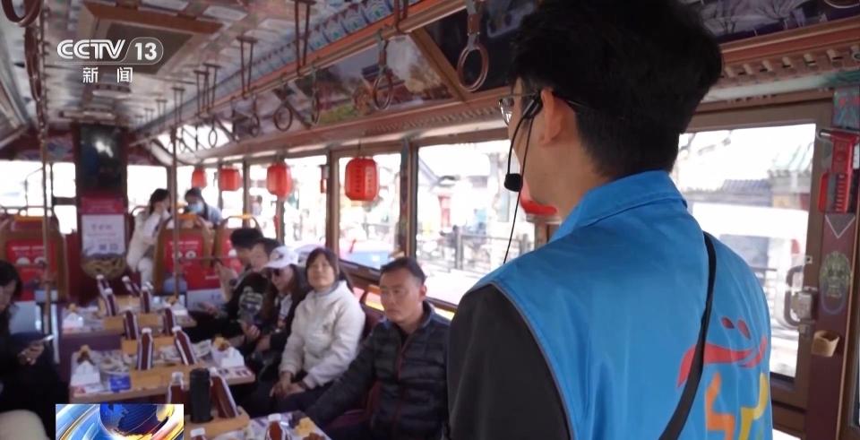 在铛铛车上,游客不仅可以听快板、看风景,还可以品美食。烤鸭、艾窝窝、驴打滚,再配上一瓶热乎乎的梨汤,大家边吃边聊边看,沉浸式体验了古都北京的深厚历史底蕴。