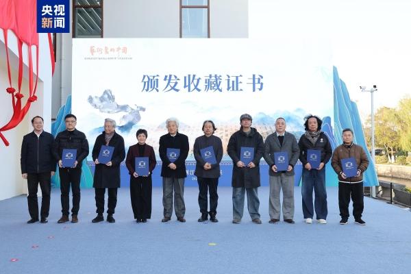 活动现场,中国国家画院首聘研究员、上海美术学院教授陈家泠,中国艺术研究院国画院艺术委员会主任赵建成,上海大学艺术研究院执行院长张海平,上海市文史研究馆馆员、上海市美术家协会中国画艺委会副主任汪家芳,上海市文史研究馆馆员、上海市美术家协会理事万芾,中国美术家协会副主席贾广健,广东省美术家协会副主席、广州画院院长宋陆京,中国国家画院书法篆刻所副所长谢小铨,中国国家画院办公室主任董雷作为艺术家代表上台接受捐赠艺术作品的收藏证书。